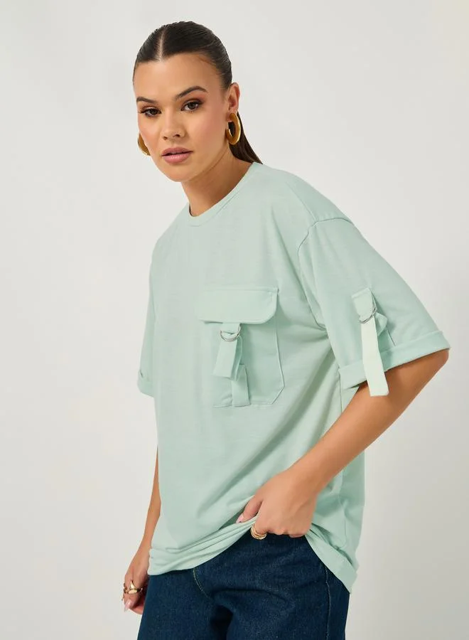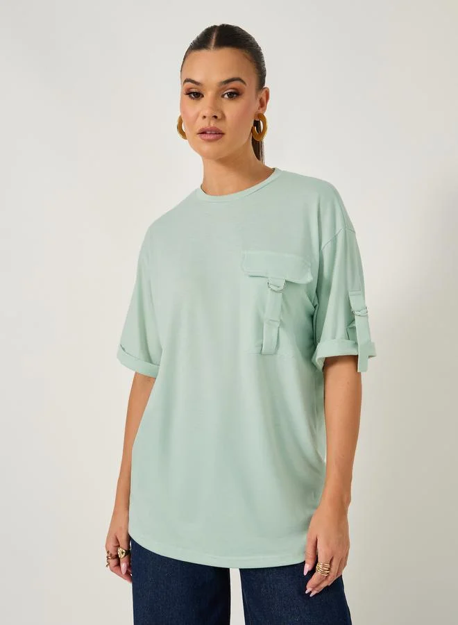 Styli Oversized Round Neck T-Shirt with Utility Pocket Detail