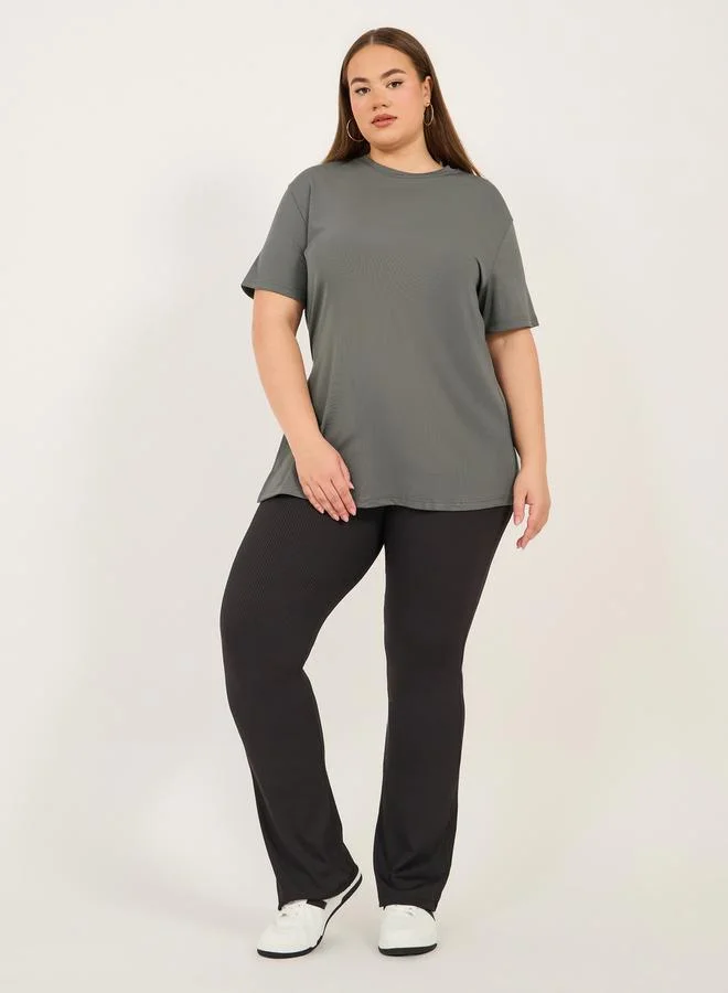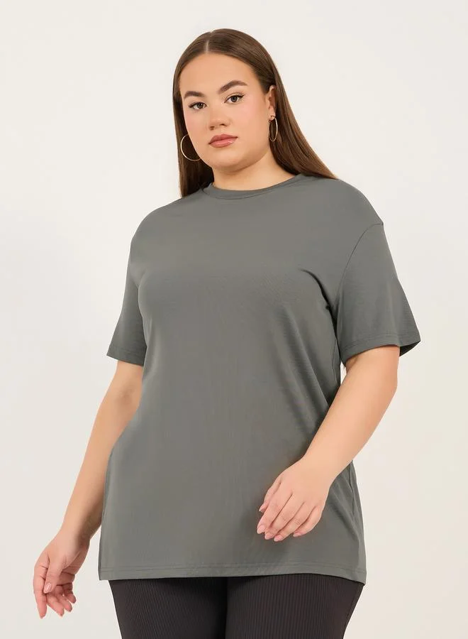 Styli Plus Size Ribbed Knit Round Neck Oversized T-Shirt