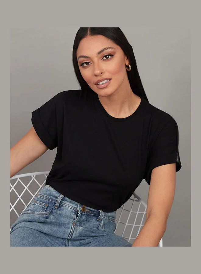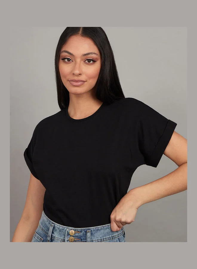 Styli Wide Shoulder Roll-Up Detail Regular Length Boxy T-shirt