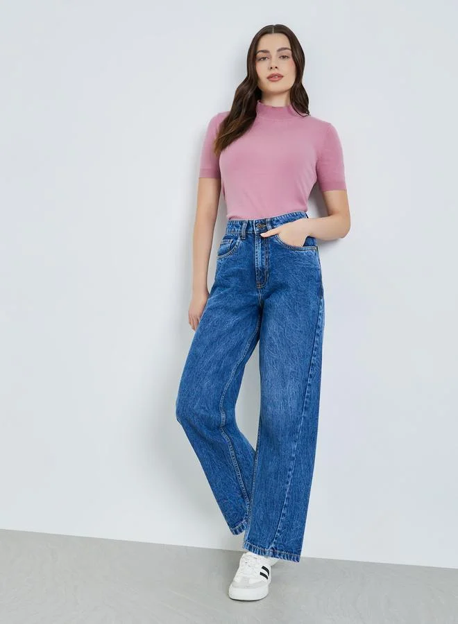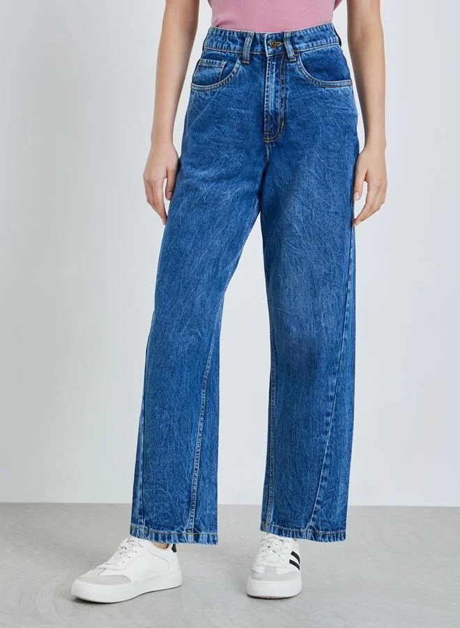 Medium blue acid-wash jeans crafted from woven cotton for a structured yet comfortable feel. Featuring a flattering high-rise waist, relaxed barrel fit, and classic five-pocket styling. These versatile jeans are perfect for casual outings, pairing effortlessly with sneakers and a tucked-in tee.