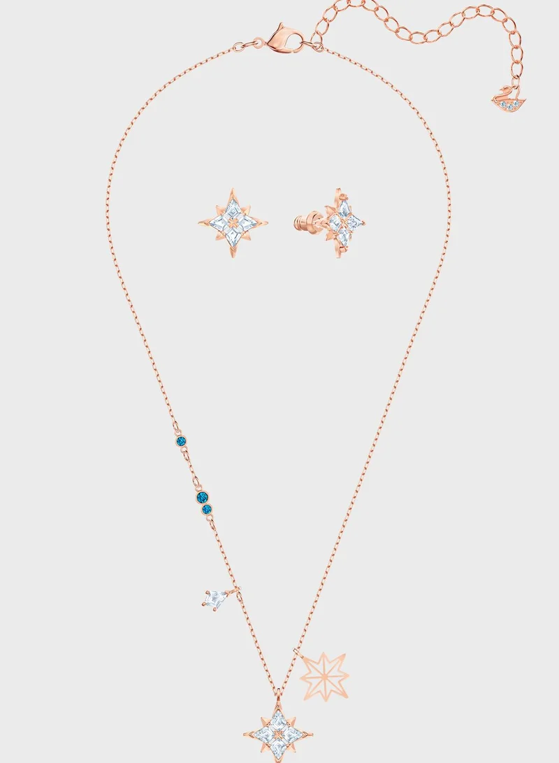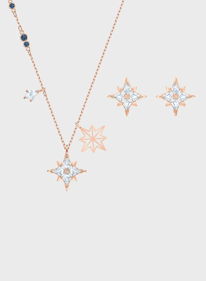 The beauty of stars is stunningly captured in this gorgeous rose-gold tone plated set, which features a necklace and a pair of pierced earrings. Dripping with stones set in a variety of techniques, the celestial-inspired designs feel both luxurious and bohemian. Perfect accessories to style for subtle winter sparkle.