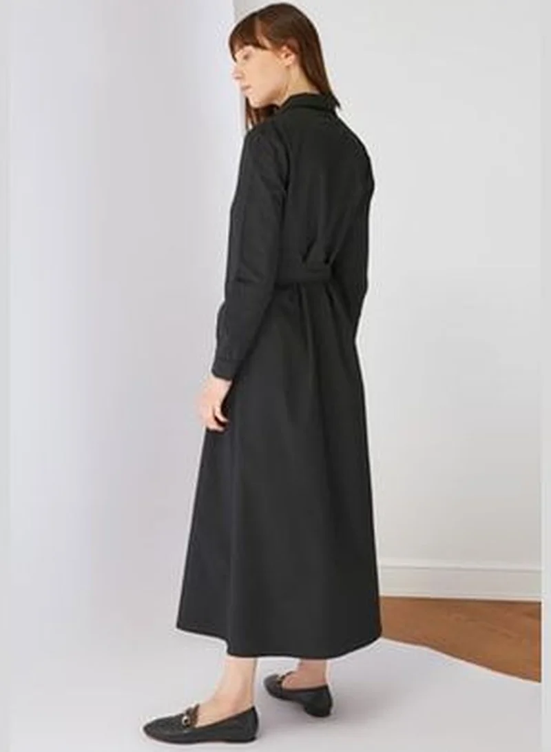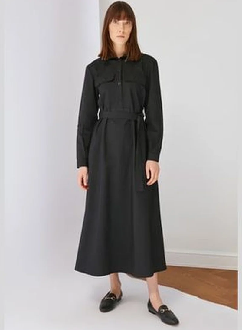 A timeless midi dress rendered in classic black with long sleeves and a matching belt. The dress features a front button closure and a fit and flare silhouette.
