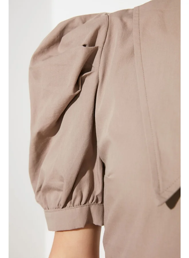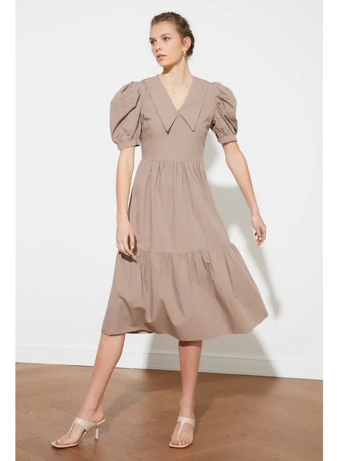 trendyol Puff Sleeves Collared Neck Tiered Midi Dress Beige