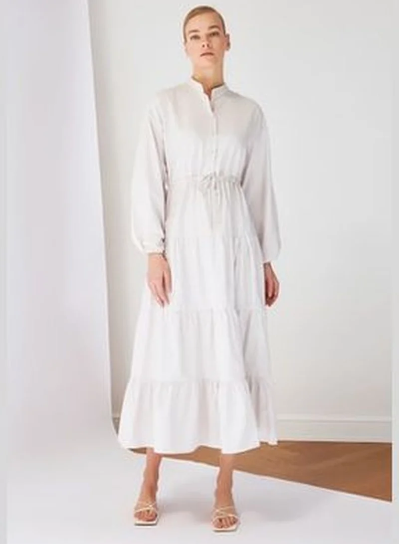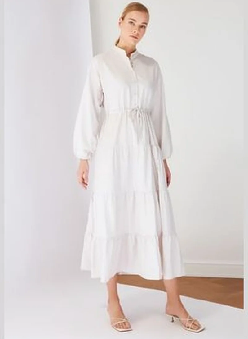 This lovely off-white dress features a soft cotton texture, a cinched waist, and a relaxed, tiered silhouette. The long balloon sleeves and mandarin collar give it a chic, comfortable style.