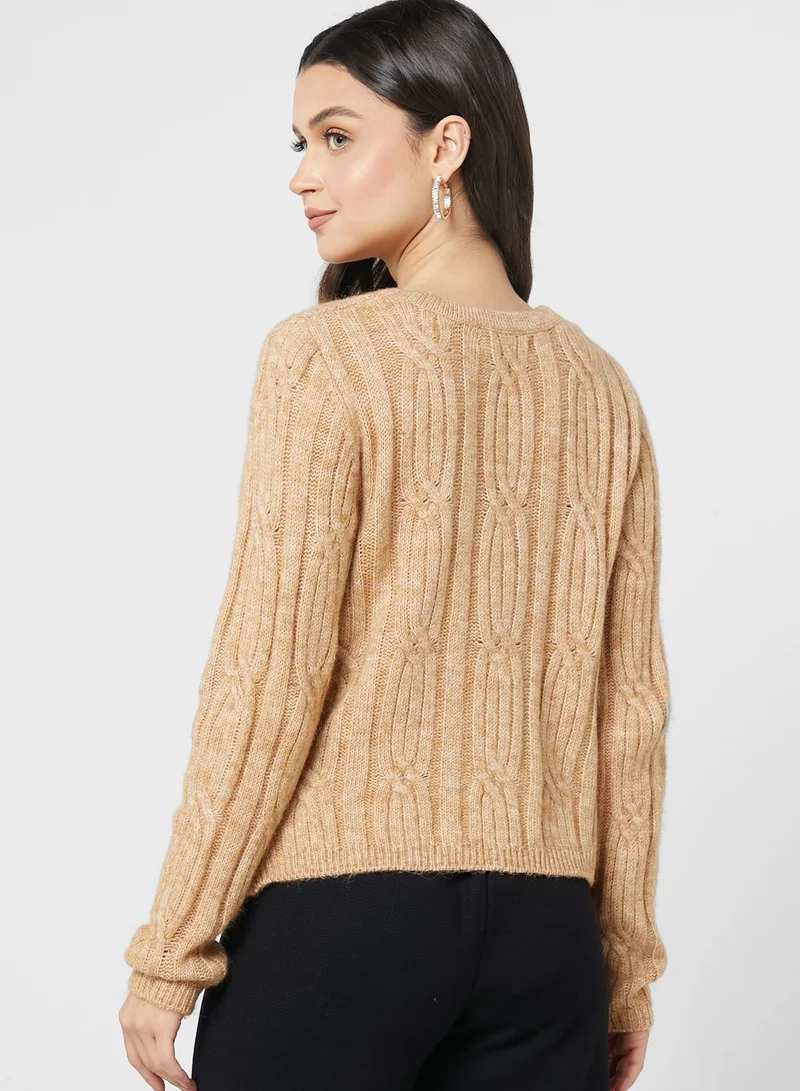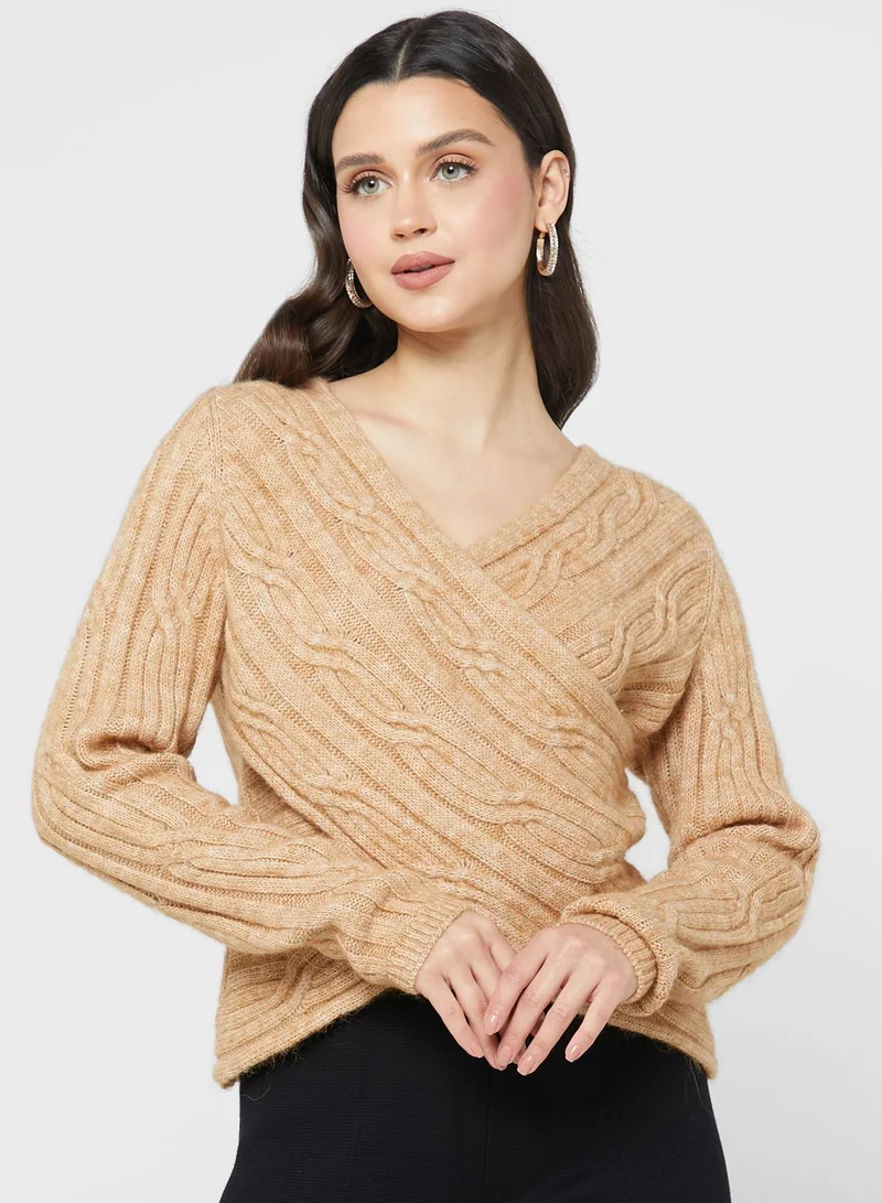 Cable knitted, comfortable polyester blend fabricMock wrap neck and long sleevesRibbed knit trims to neck, cuffs, and hemEach item sold separately
