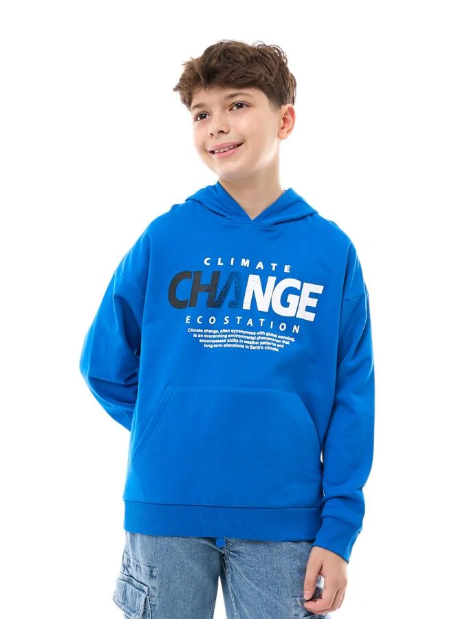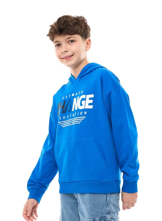 Stay stylish and comfy in this blue cotton hoodie with a climate change slogan. Perfect for daytime fun!