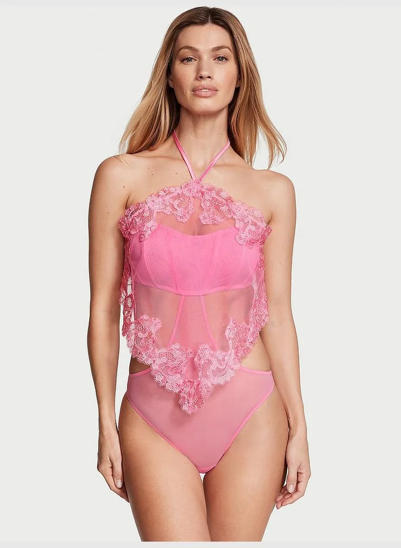 A unique handkerchief overlay combines with our newest embroidery on this fresh and flirty design. Double-lined on top but subtly sheer, this statement-making style is one you'll want to show off in an out of the bedroom. Wireless Halter with tie closure Open back with hook-and-eye closures Cutout accents Handkerchief overlay Sheer mesh body Minimal back coverage: lots of cheek peek Cotton gusset panel Partially made from recycled materials Hand wash Imported