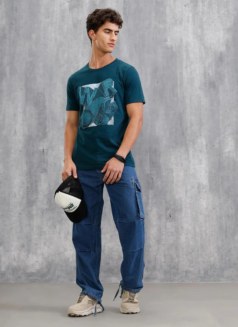 A Fresh Take On Casual Style, This Teal Crew Neck Stands Out With A Chest Graphic Inspired By Denim Patchwork Artistry. The Layered, Stitched-Effect Print Adds Depth And Texture Without Losing The Shirt’S Clean, Modern Appeal. Easy To Pair And Easier To Wear, It’S A Subtle Nod To Craft-Driven Design.
