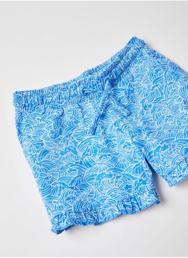 Blue shorts for girls, with a tropical printed pattern. 100% cotton. Elasticated waistband with drawstring, frill hems and side pockets.