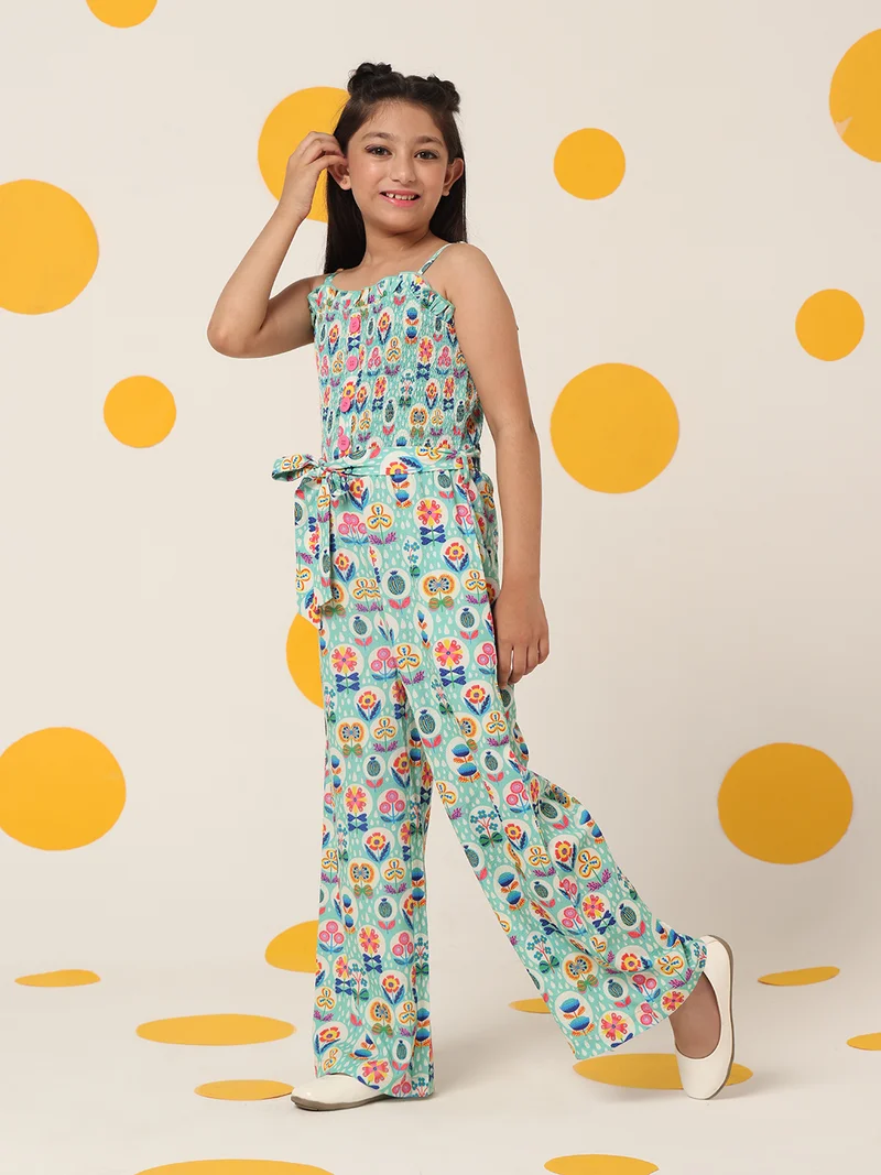 Cherry & Jerry Girls Turquoise Printed Seersucker Full Length Jumpsuits