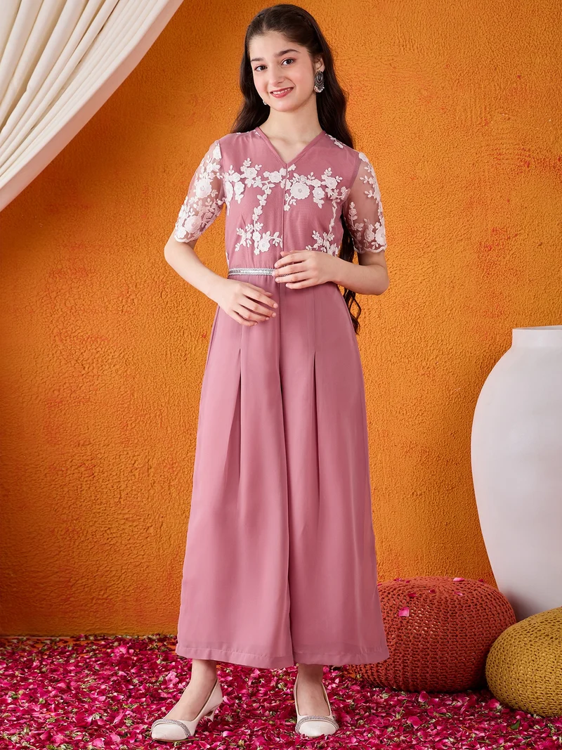 Cherry & Jerry Woven Half sleeves Embroidered Straight Jumpsuit-Pink