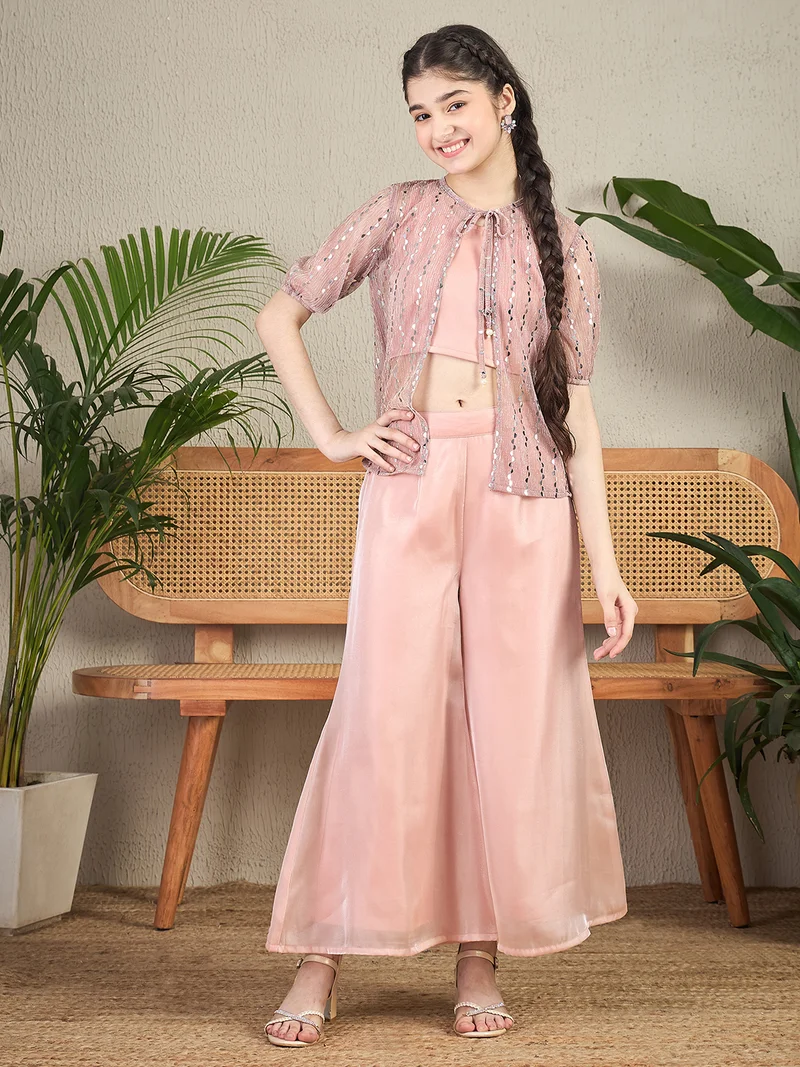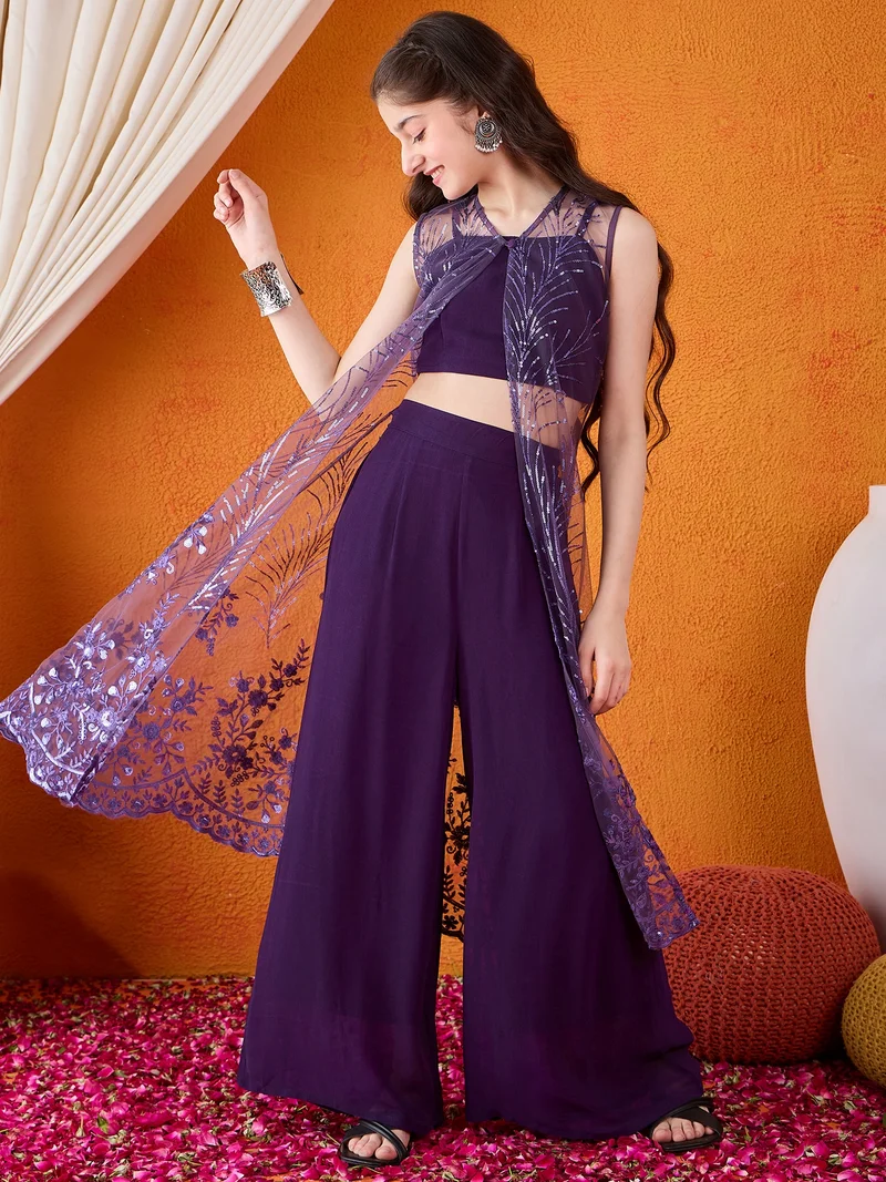 Cherry & Jerry Woven Sleeveless Embellished shrug, Crop top and Bottom Sets-Purple