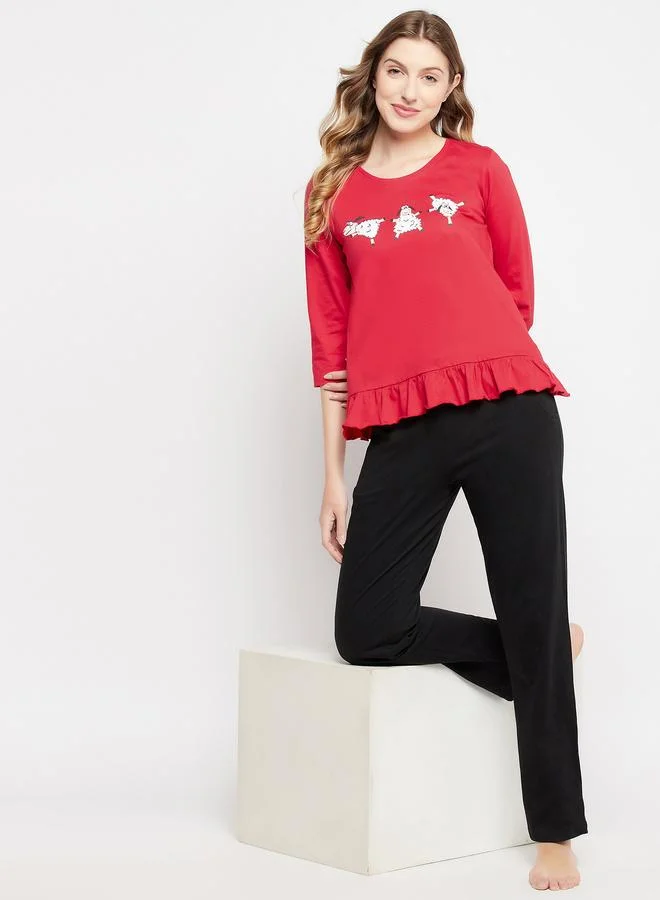 Clovia Solid Round Neck T-Shirt and Printed Pyjama Set