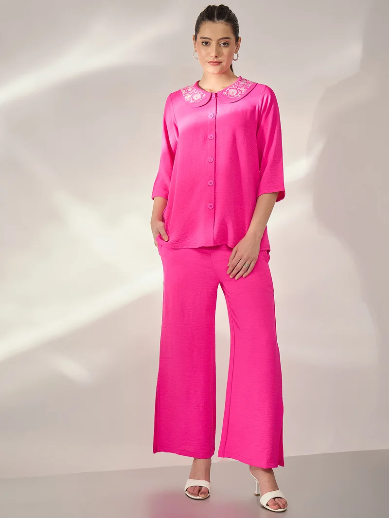 Globus Women Blue Halter Neck Self Design Sleeveless Top & Trousers Party Co-Ord Set