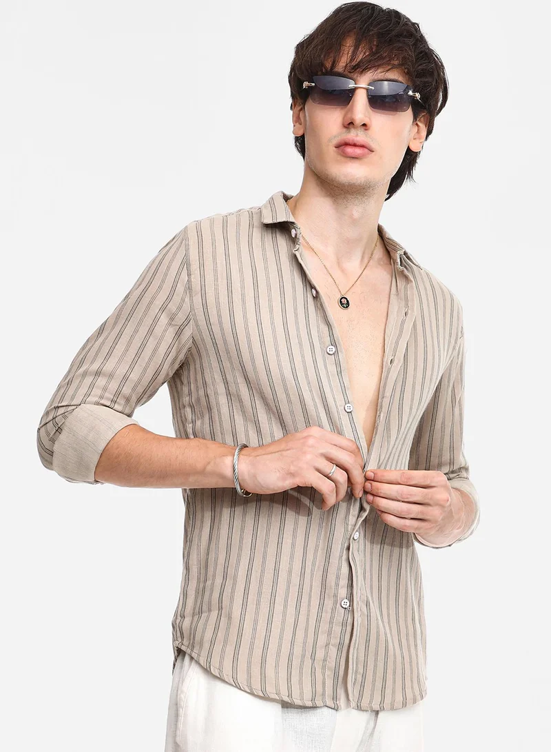 Men's Tan Brown Stripe-Creased Shirt For Casual Wear | Spread Collar | Long Sleeves | Button Closure | Shirt Crafted With Comfort Fit For Everyday Wear