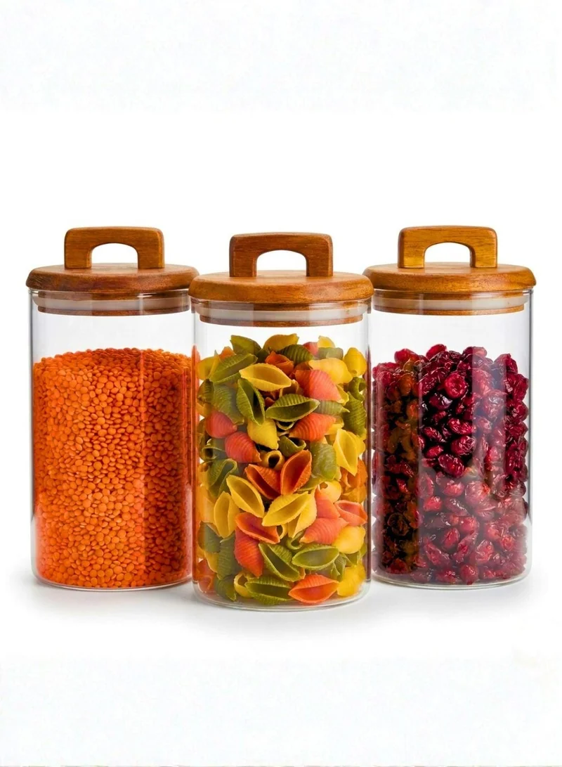 Borosilicate Glass Food Storage Jar With Acacia Wood Air Tight Lid, Handmade Glass Canister For Kitchen Pantry Organizer, For Storing Pasta, Nuts, Coffee, Snacks, Set Of 3 (1000 ML)