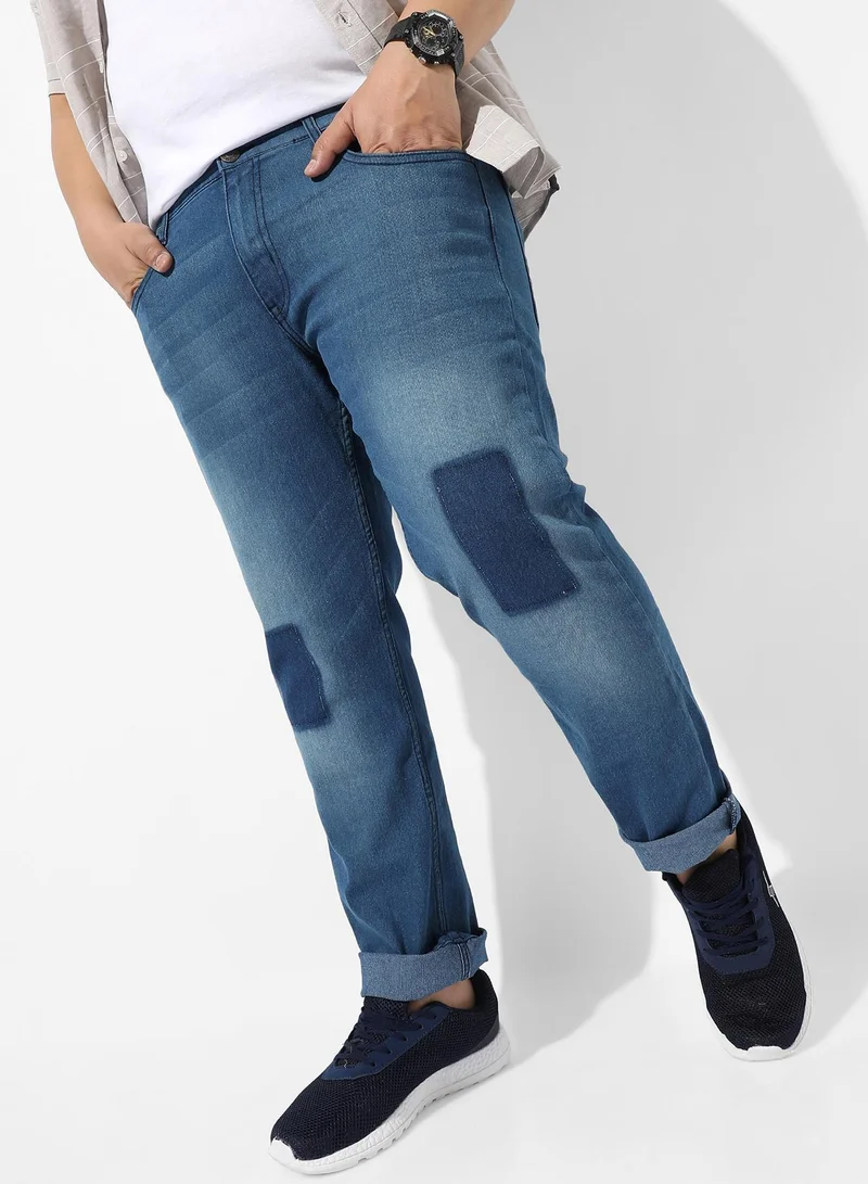 Men's Dark Blue Patched Straight Denim Jeans For Casual Wear | Mid-Rise | Straight Fit | Button Closure | Plus Size Denim Jeans Crafted With Comfort Fit For Everyday Wear