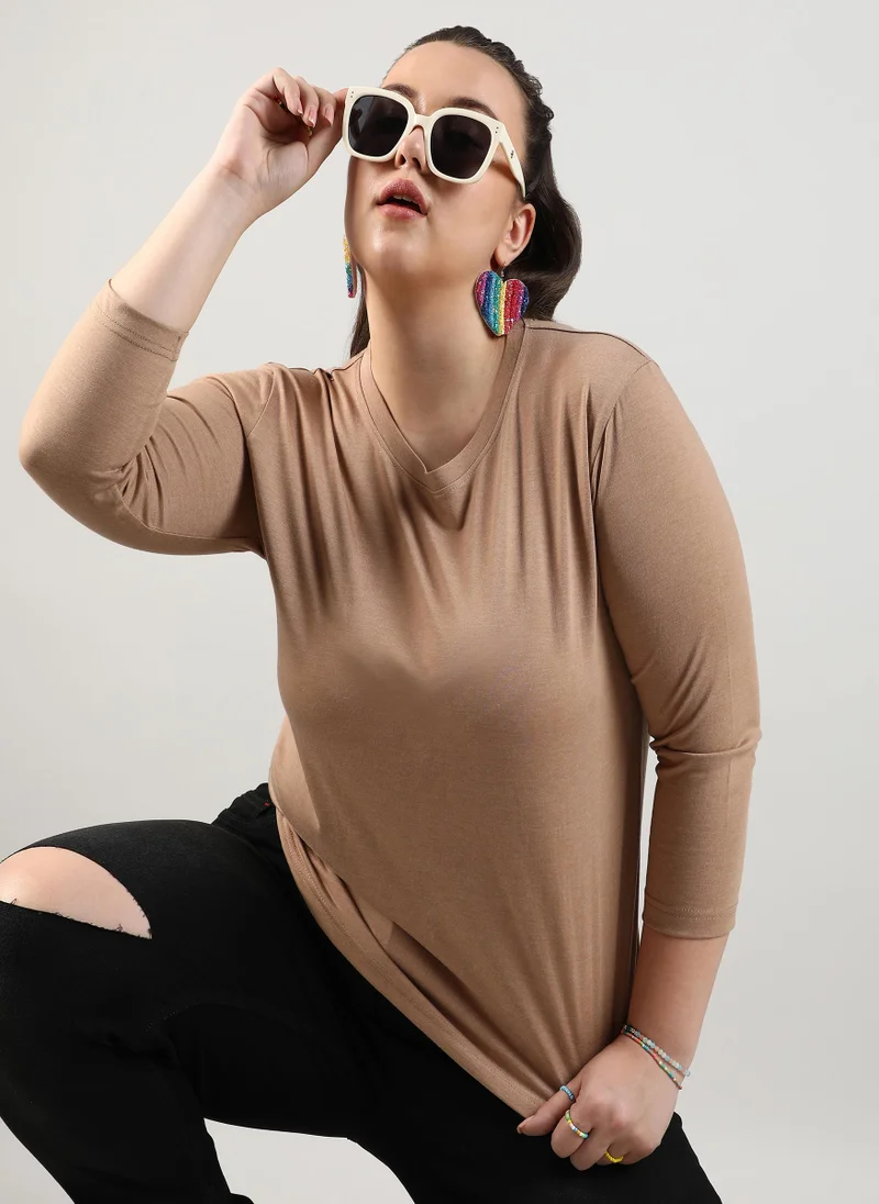 Women's Beige Basic Solid Top For Casual Wear | Round Neck | Quarter Sleeve | Pull On Closure | Top Crafted With Comfort Fit For Everyday Wear