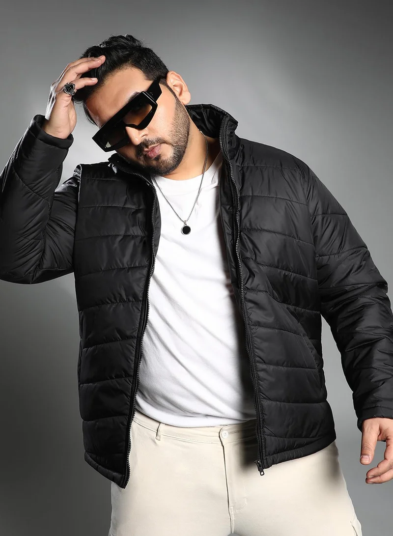 Instafab Plus Men's Onyx Black Chevron Quilted Jacket For Casual Wear | High Neck | Long Regular Sleeves | Zipper Closure | Plus Size Jacket Crafted With Comfort Fit For Everyday Wear