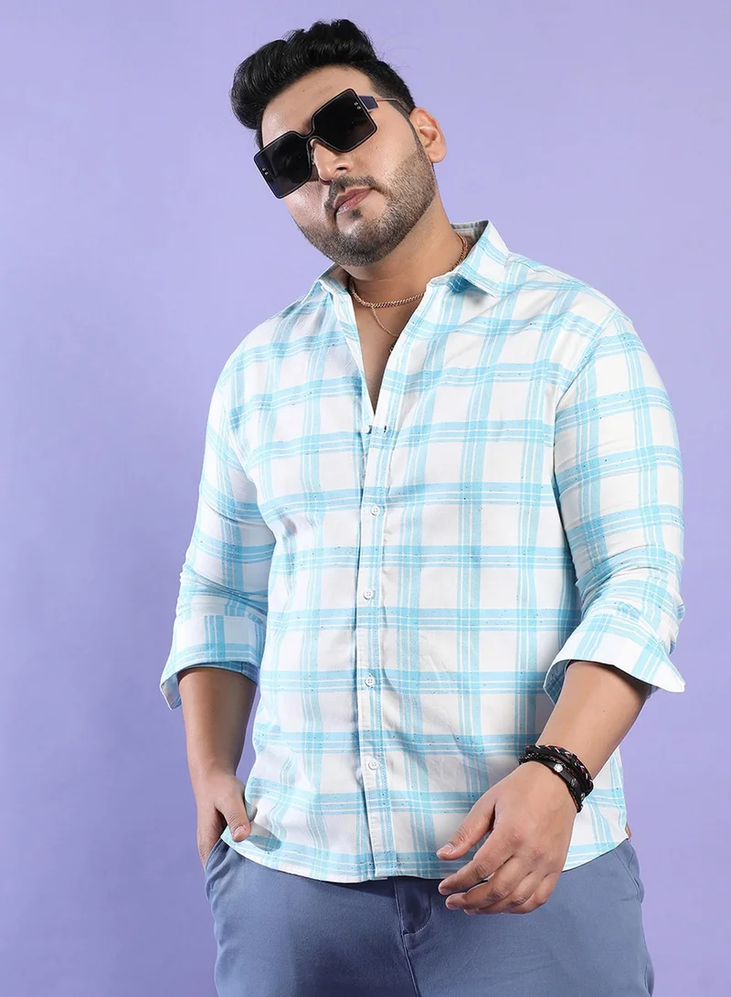 Instafab Plus Men's White & Light Blue Tartan Plaid Shirt For Casual Wear | Spread Collar | Long Sleeve | Button Closure | Cotton Shirt Crafted With Comfort Fit For Everyday Wear
