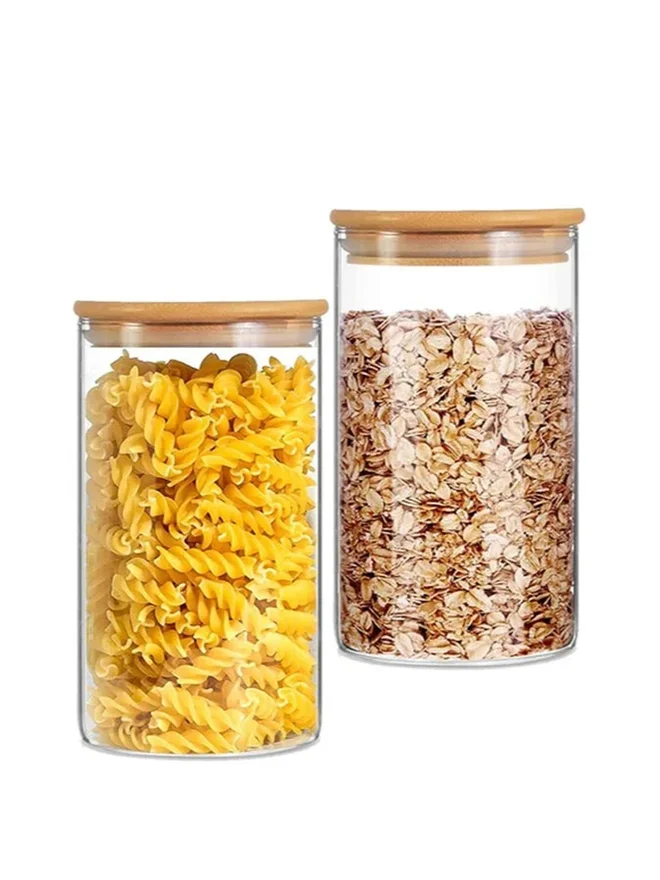 1CHASE 2-Piece Borosilicate Glass Storage Jar With Airtight Bamboo Lid and Metal Handle 700ML Oval