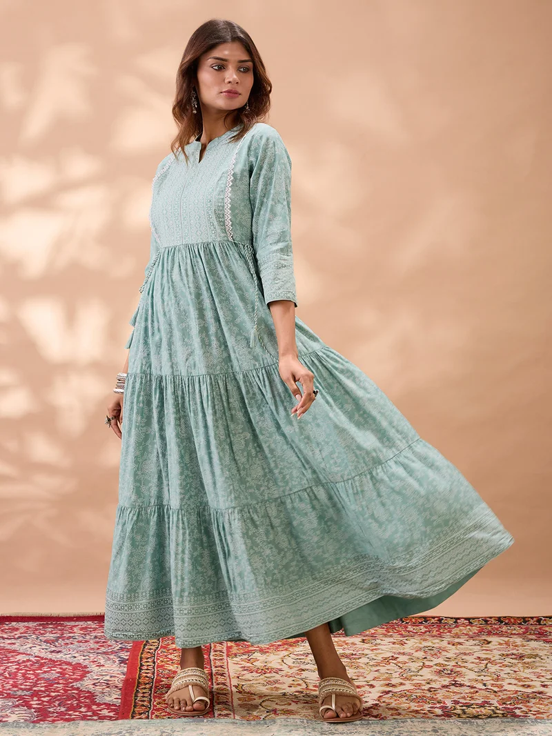 Globus Women Mandarin Collar Puff Sleeves All Over Ethnic Print Fit & Flare Maxi Dress