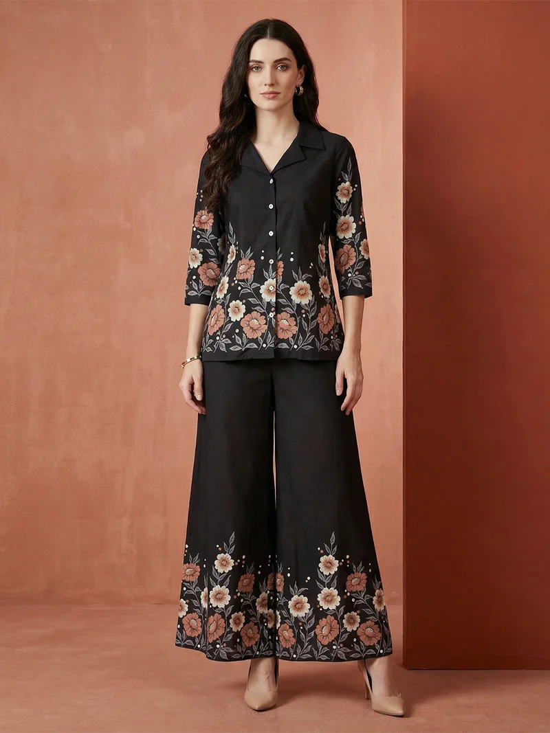 Globus Women Black Floral Print Collared Neck Shirt with Flared Hem Wide Leg Pant Fusion Co-Ord Set