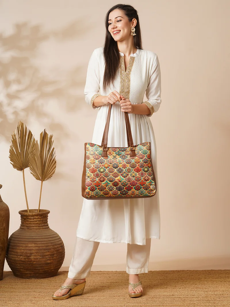 Globus Women V-Neck Bishop Sleeves Ethnic Printed Cut-Out Detail Fit & Flare Fusion Maxi Dress