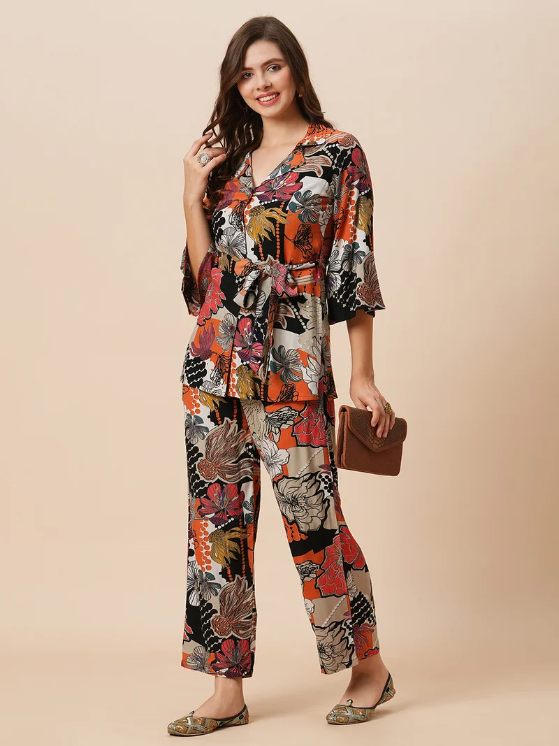 Globus Women Coral Shirt Collar Puff Sleeves Abstract Print Tunic With Palazzos & Embroidered Belt Festive Co-Ord Set
