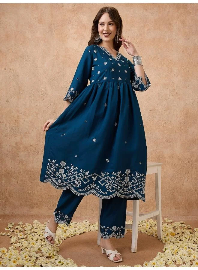 Globus Women Thread Work Detail V-Neck A-Line Workwear Kurta & Pants Set