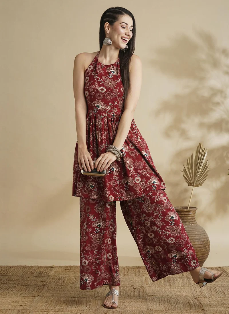 Globus Women Maroon Woven Design Tie-Up Neck A-Line Fusion Kurta