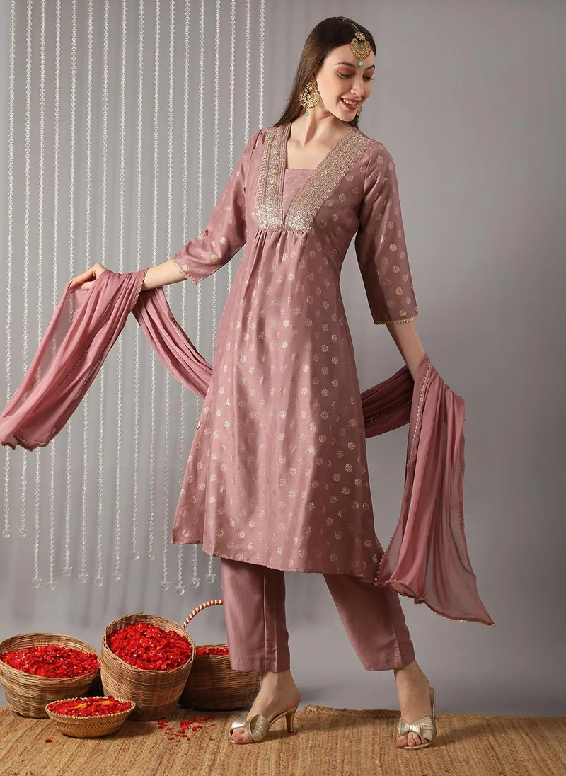 Globus Women Pink Sequin Embroidered Yoke Gold Foil Print Panelled Anarkali Kurta With Pants & Gotta Patti Dupatta Festive Set