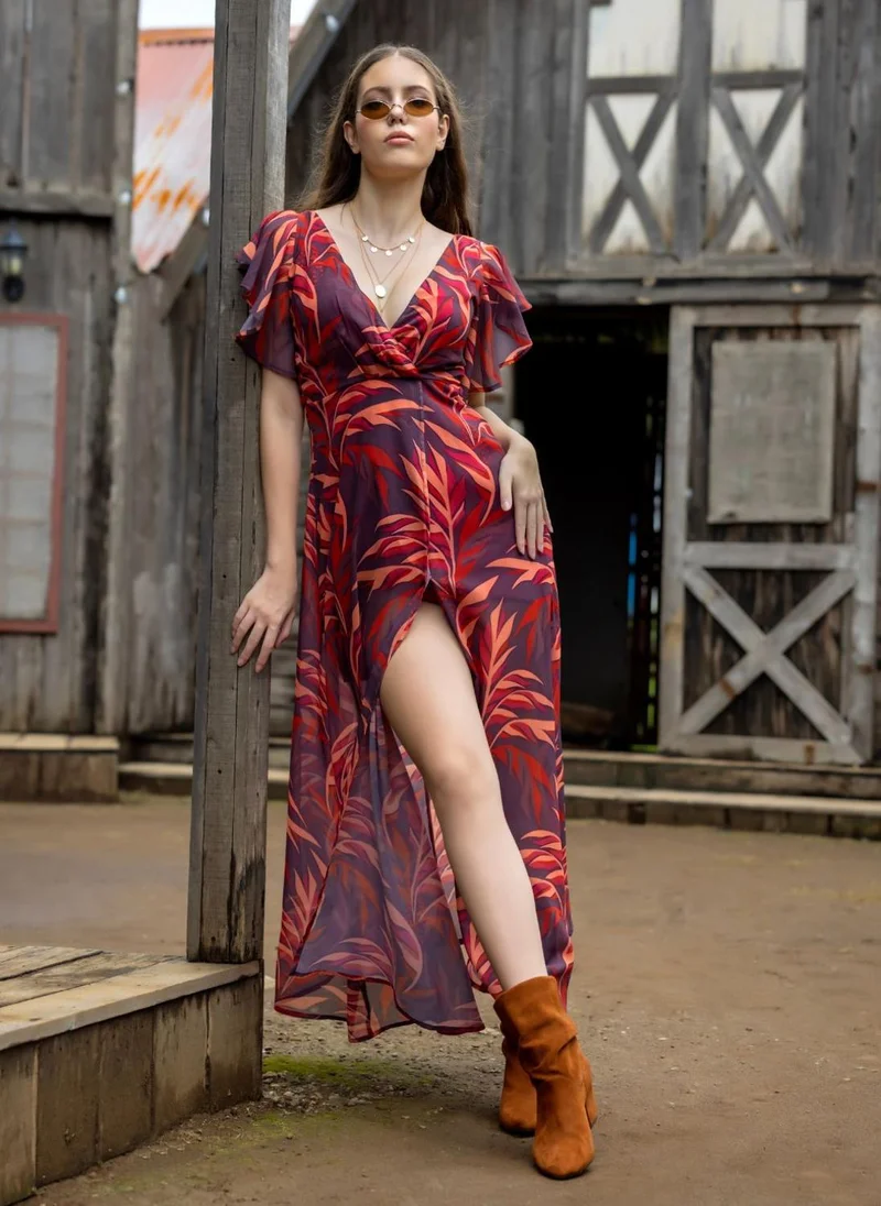 Embroidered Notch Neck Front Slit A-Lin Midi Dress with Belt