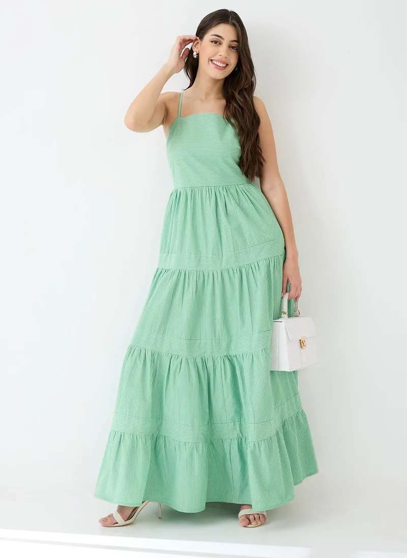 Globus Women Green Square Neck Strappy Shoulder Striped Smocked Tiered Fit & Flare Maxi Dress