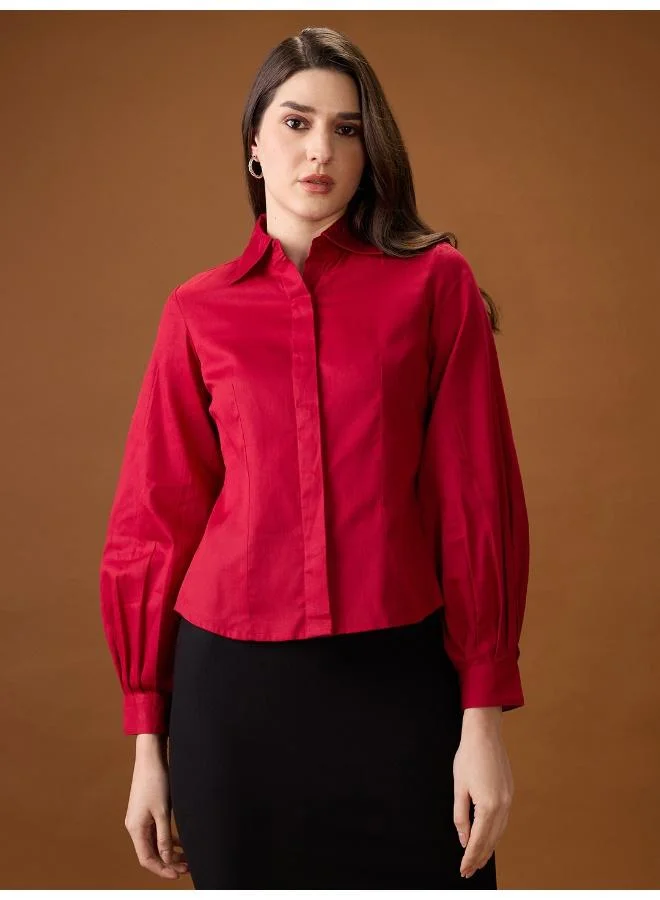 Globus Women Mandarin Collar Puff Sleeves Waist Tie-Ups Tiered A-Line Workwear Midi Dress