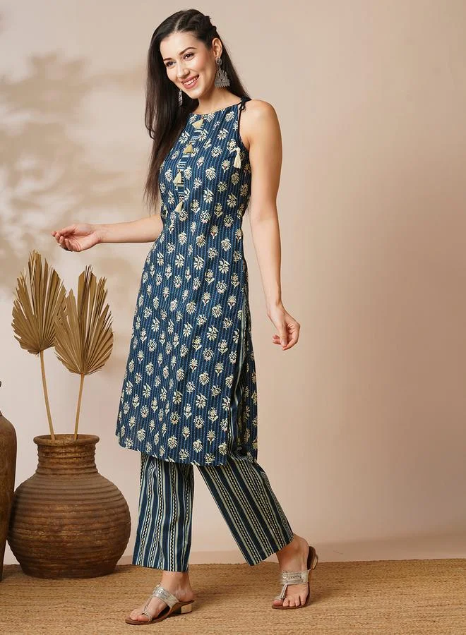 Women Olive V-Neck Floral Foil Print Kurta with Pants Set