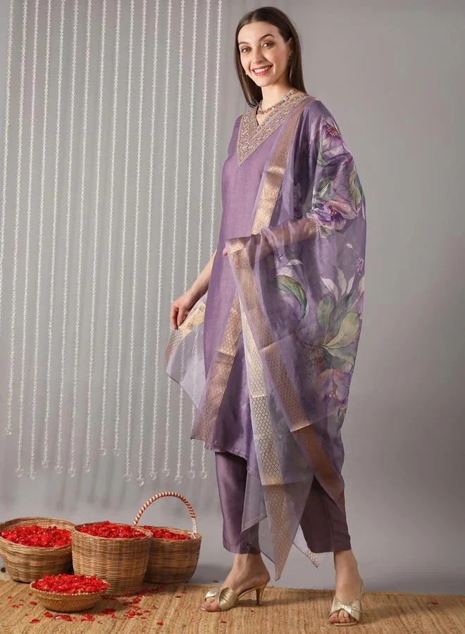 Embroidered Front Slit Kurta, Pants and Floral Prind Dupatta Set