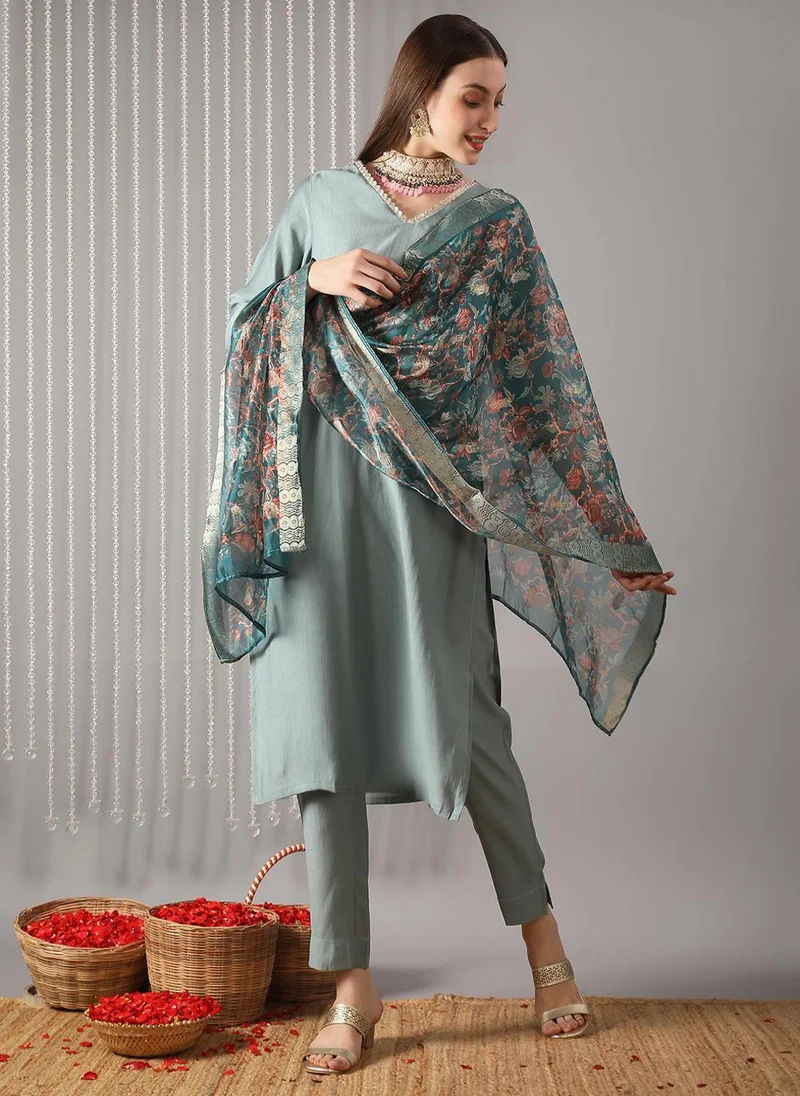 Globus Women Green Square Neck Strappy Sleeves Sequin Detail Gotta Lace Hem A-Line Kurta With Palazzos & Frill Dupatta Festive Set
