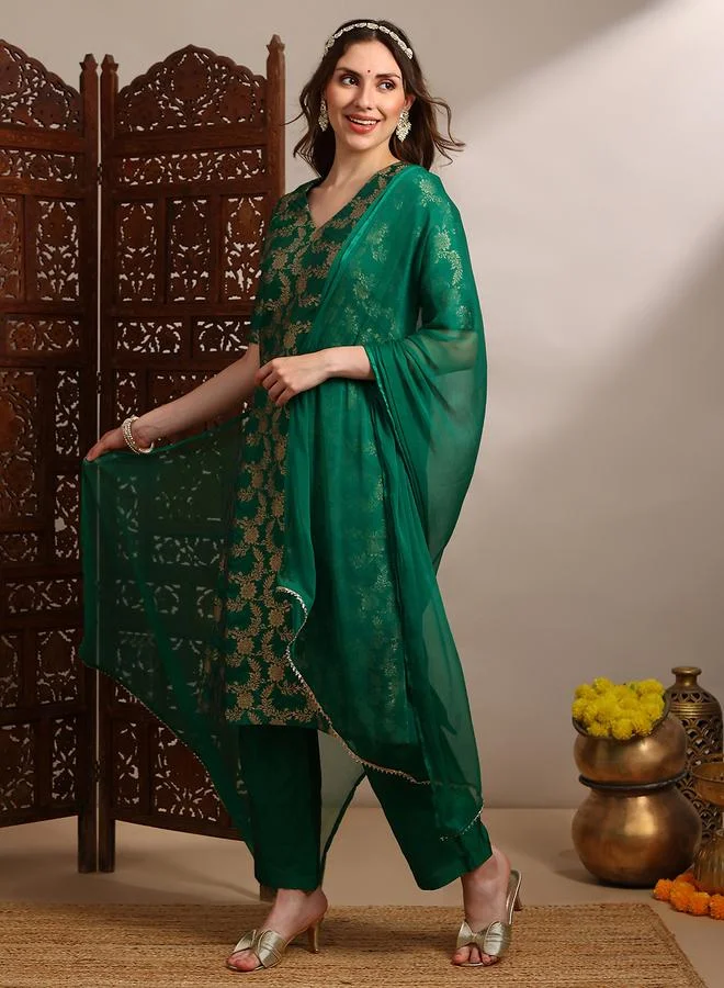 Women Green Floral Woven Straight Kurta with Pants and Taping Dupatta Set