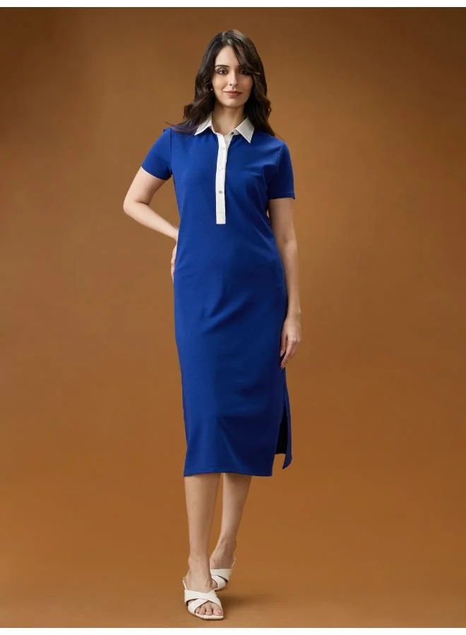 Globus Women Blue Collared Neck Short Sleeves Solid Side Slits Midi Workwear Shirt Dress