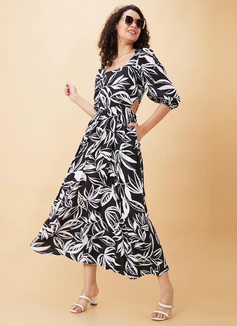 Globus Women Floral Printed Square Neck Puff Sleeves Waist Cut-Out Mini Fit & Flare Dress