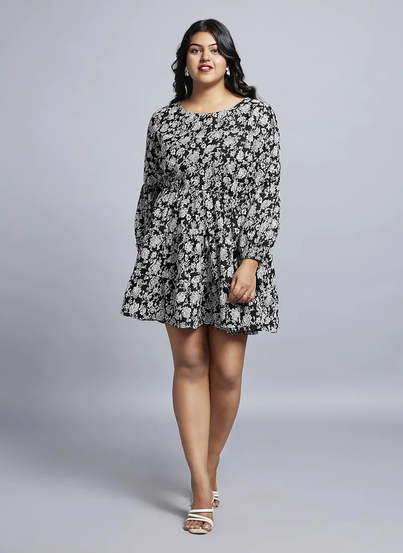 Globus Women Black Allover Floral Print High Neck Bishop Sleeves Belted Fit & Flare Midi Dress