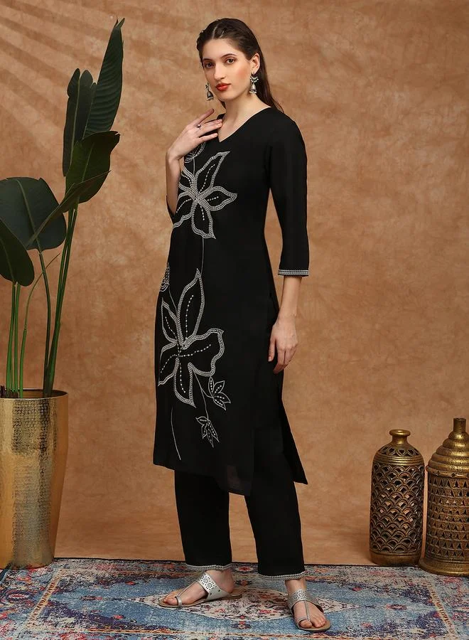 Women Black Floral Embroidered Kurta with Wide Leg Pants Set