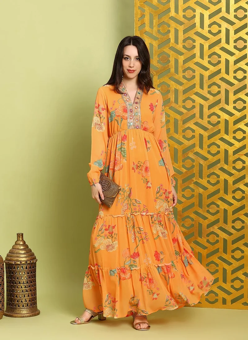 Globus Women Black Printed Tie Sleeves Tiered Midi Dress