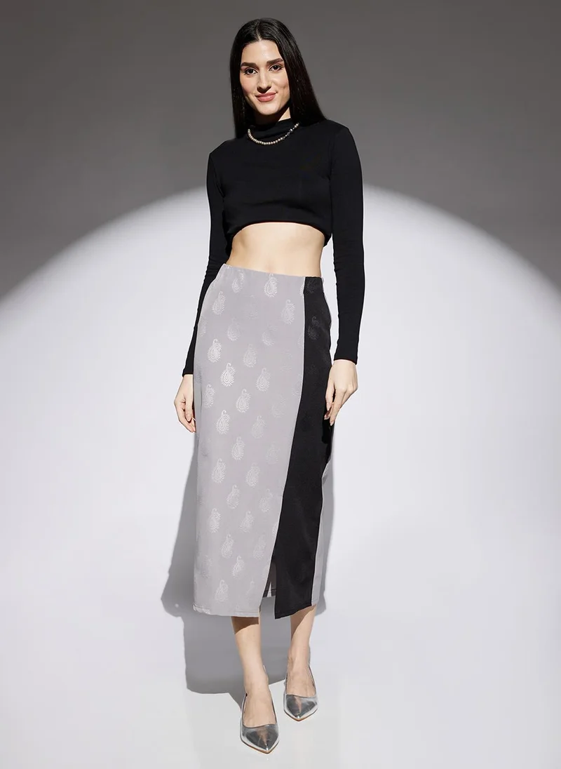 Women Grey & Black Paisley Print Mid Rise Front Slit Midi Skirt