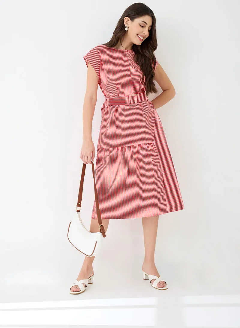 Globus Women Red Round Neck Extended Sleeves Striped Gathered A-Line Midi Dress With Belt