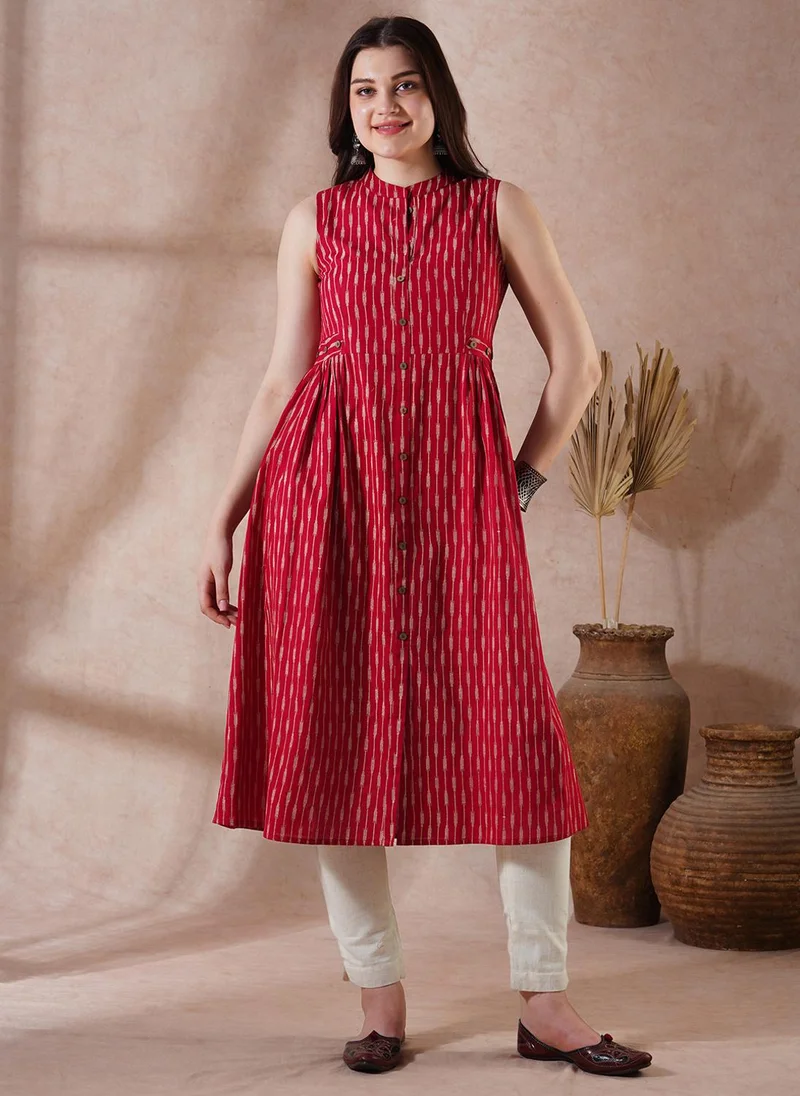 Globus Women Maroon Striped Mandarin Collar Pleated Button-Down Front Slit Workwear Kurta