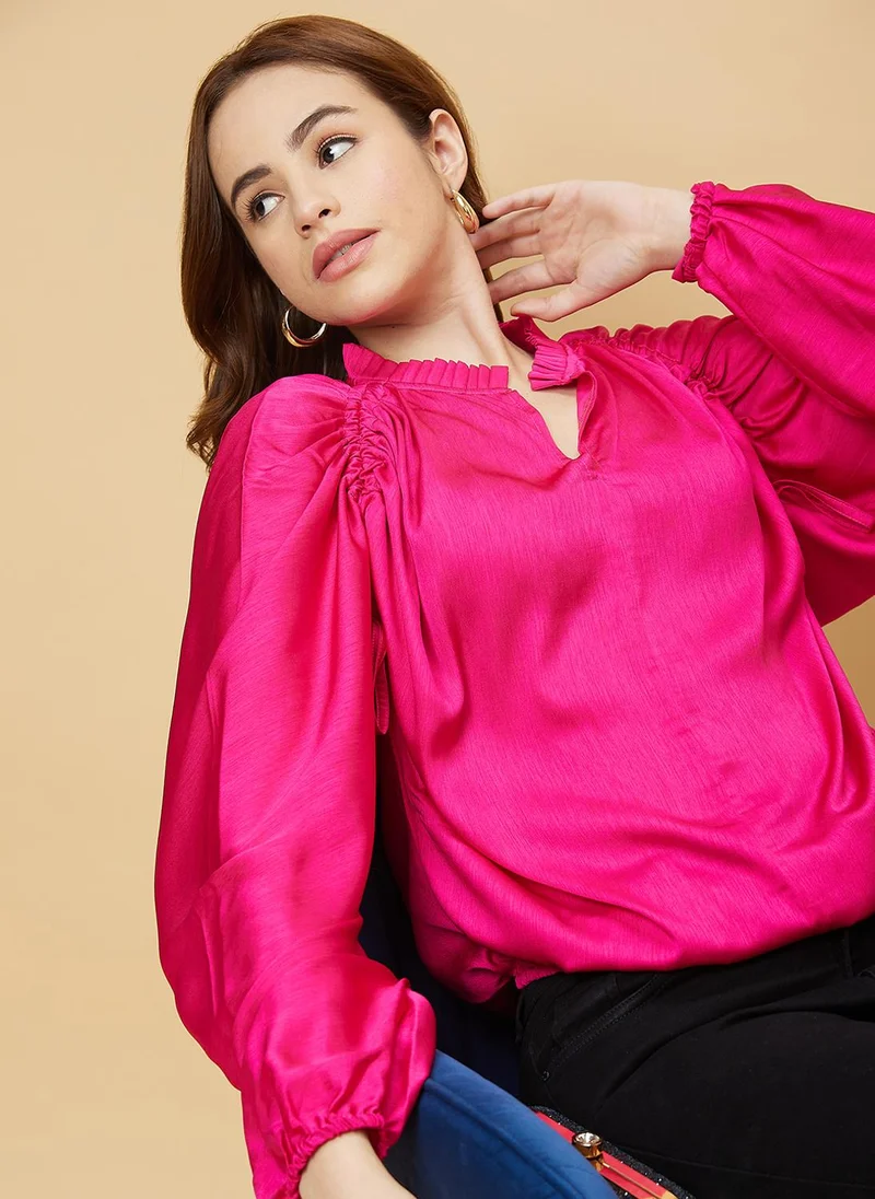 Globus Women Pink Mandarin Collar Puff Sleeves Regular Top