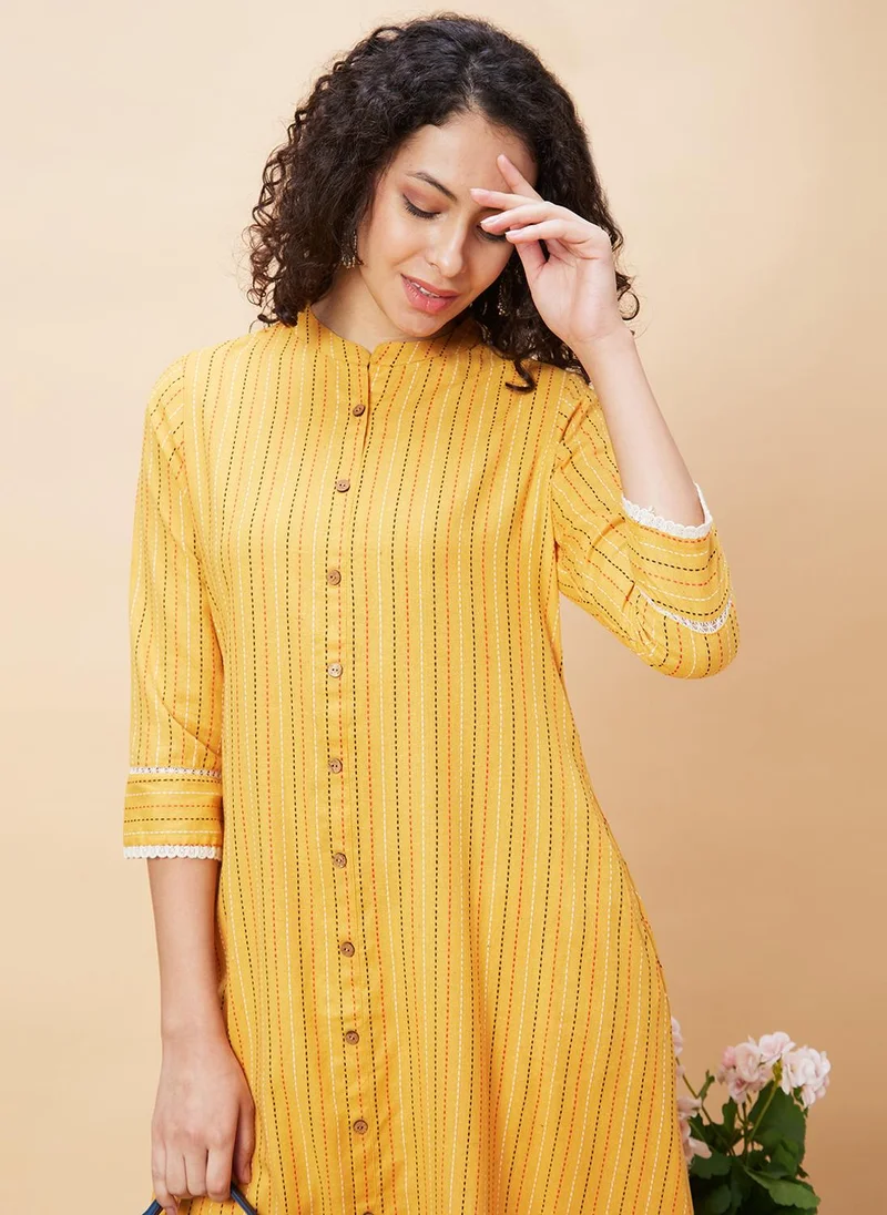 Globus Women Striped Mandarin Collar Pure Cotton Kurta