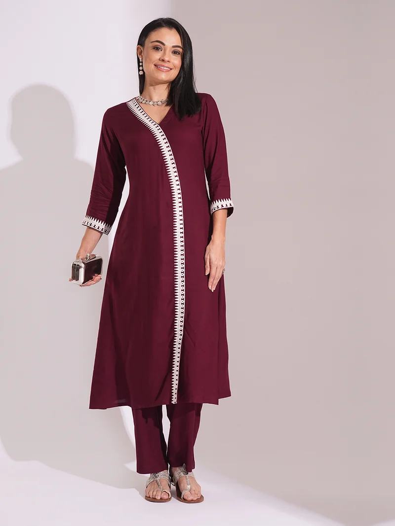 Globus Women Maroon Mandarin Neck Floral Embroidered Panelled A-Line Workwear Kurta